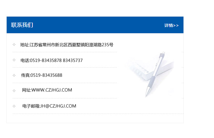 傳真:0519-83435688    郵編:213135    網址:WWW.czjhgj_com.anntellkj.com    電子郵箱:JH@czjhgj_com.anntellkj.com
